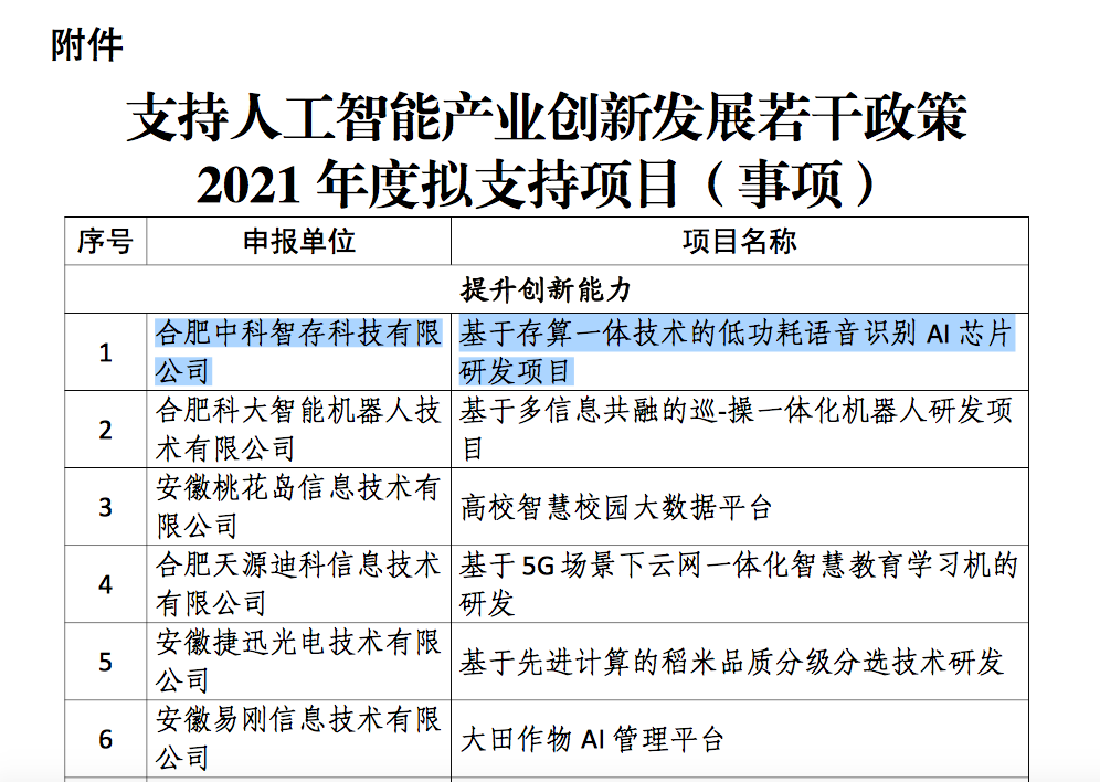 據(jù)悉,本次項目包括提升創(chuàng)新能力、建設(shè)支撐平臺、支持項目建設(shè)、推進示范應(yīng)用等方面共有32個企業(yè)成功入選。合肥中科智存科技有限公司(以下簡稱中科智存)基于存算一體技術(shù)的低功耗語音識別AI芯片研發(fā)項目成功入選。